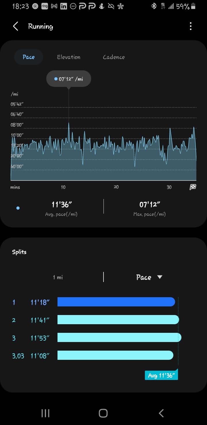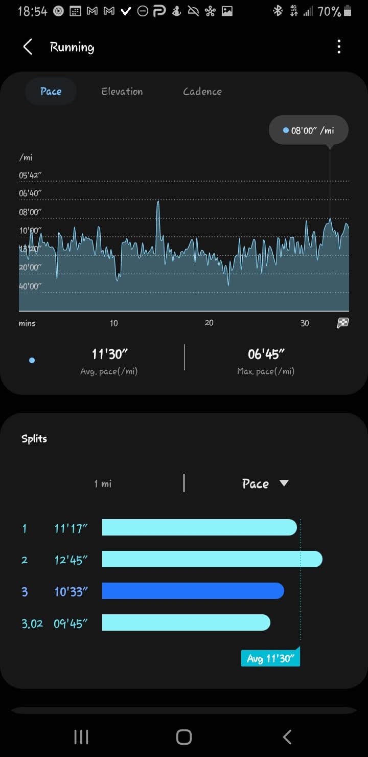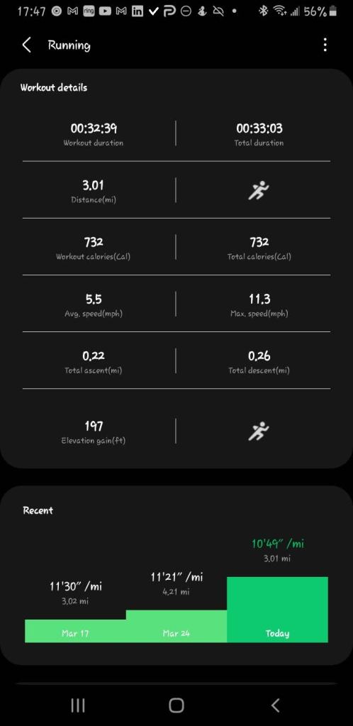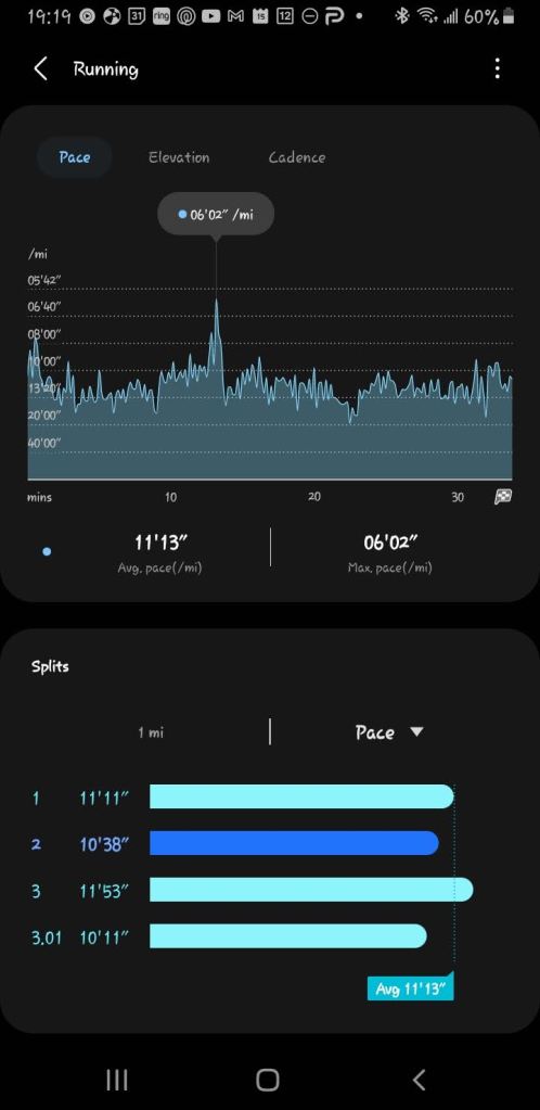 Today I hit a milestone. Not a big one, but an important one. My first 3 mile run since I started again where my average was below 11 minutes per mile: 10’49”. I also had my fastest pace going uphill.