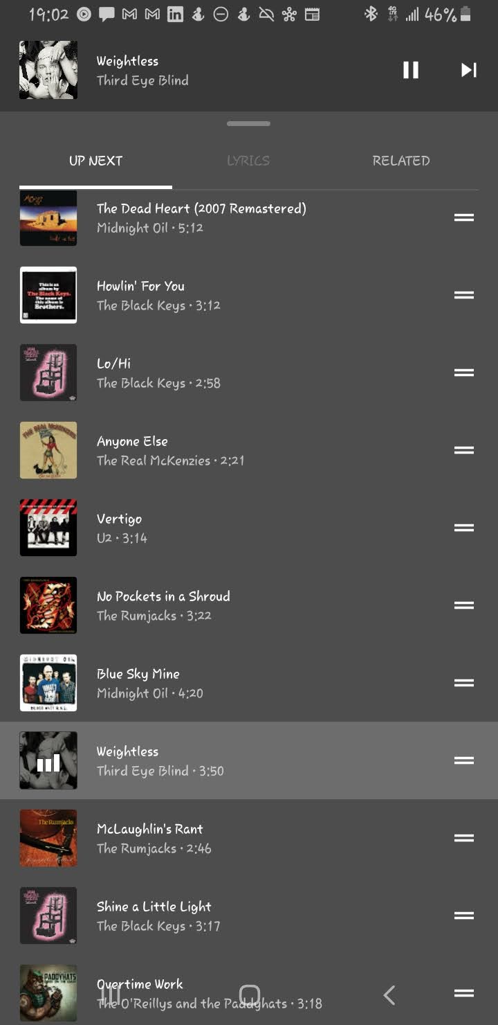 Anyone Else, Vertigo, No Pockets in a Shroud were all good songs for end of run. I didn’t know if Weightless would be, so most of my speed test was with Blue Sky Mine, though I started it on No Pockets in a Shroud.