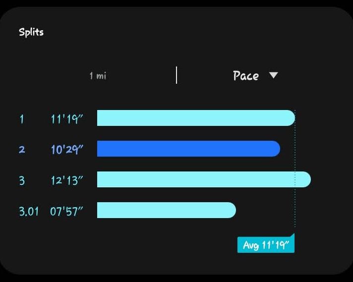 My average pace was the same pace as mile one, of which 0.8 miles was uphill. Mile two took me down what I just climbed. I had a strong finish, as evidenced by my last 0.01 mile split, at 7’57” / mi.