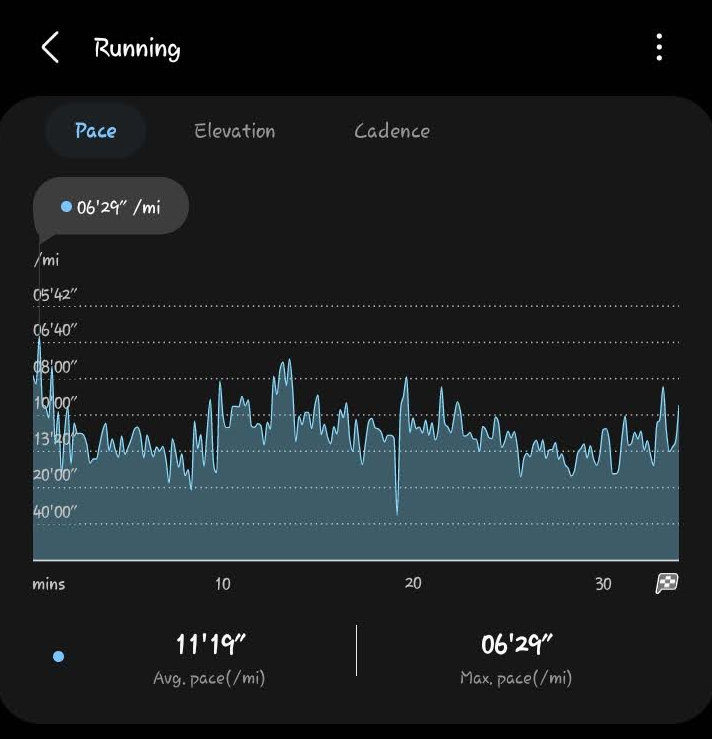 My average pace was the same pace as mile one, of which 0.8 miles was uphill. Mile two took me down what I just climbed. I had a strong finish, as evidenced by my last 0.01 mile split, at 7’57” / mi.