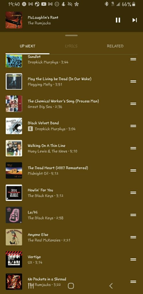 My playlist was decent; Anyone Else by The Real McKenzies, Vertigo by U2, and No Pockets in a Shroud by The Rumjacks were great to end on. I had to skip Lo/Hi because it felt too much like the previous song, and I needed a faster pace.
