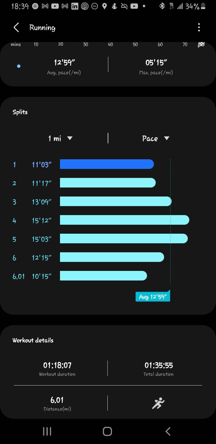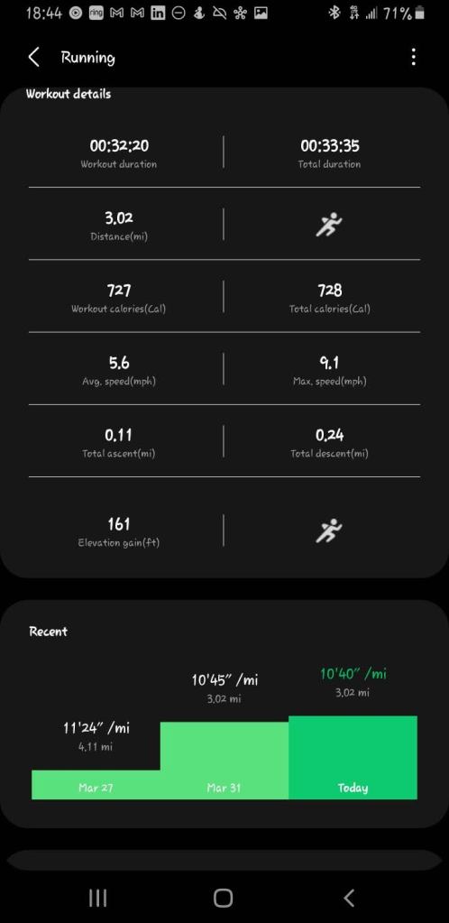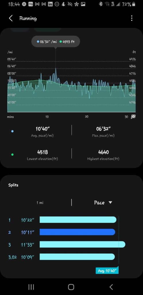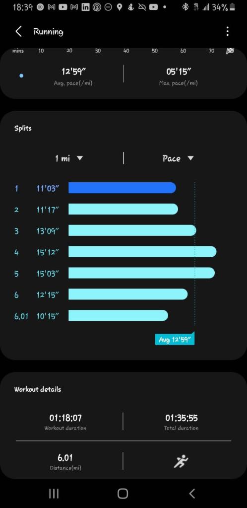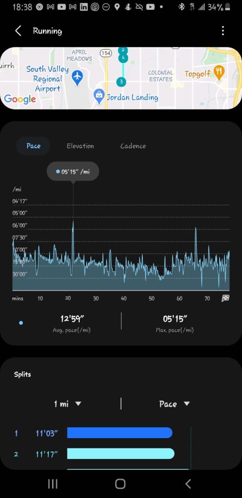 I had my best yet average pace, going the reverse of my usual direction. I didn’t feel as week and exhausted going up the hill that direction as I have the past few times. I was still pretty slow going up, but not so exhausted that I couldn’t take good advantage of the hill going back down after rounding the corner.